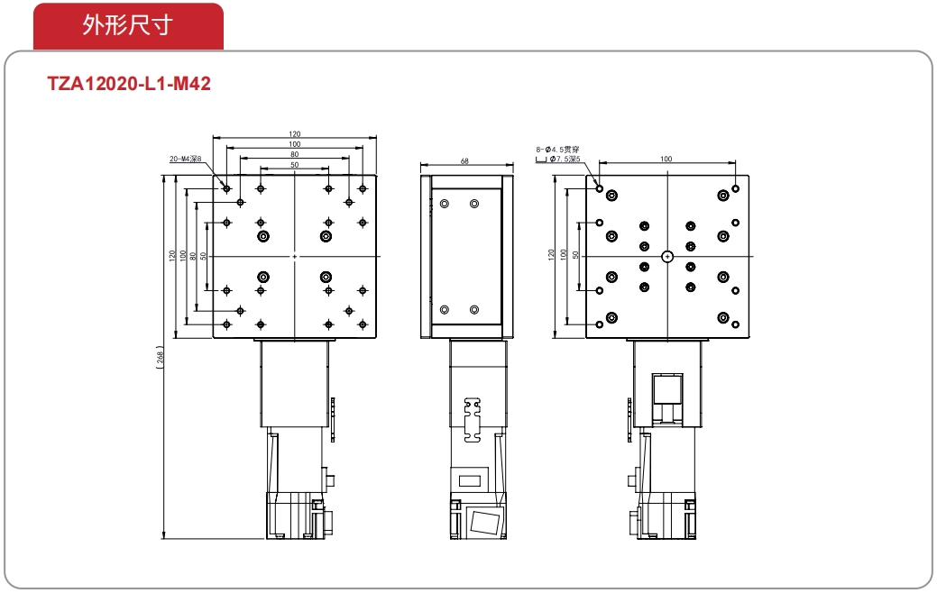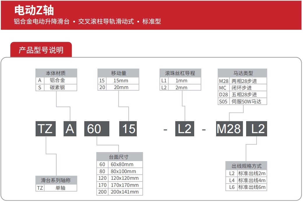 电动Z轴铝合金滑台系列是TOKK为解决小空间、高使用频率等情况专门设计的电动升降滑台。产品本体材料采用硬质铝合金,表面黑色阳极氧化处理,**防止反射光对光源的影响;传动部件采用高精密滚珠丝杠、楔块式导轨滑块,耐磨性好、强度高、负载能力强;该系列产品非常适合集成在对空间、尺寸、重量要求较高的自动化设备、精密仪器设备中,也比较适合使用在运动范围较小、往复频率高的工业生产线中。