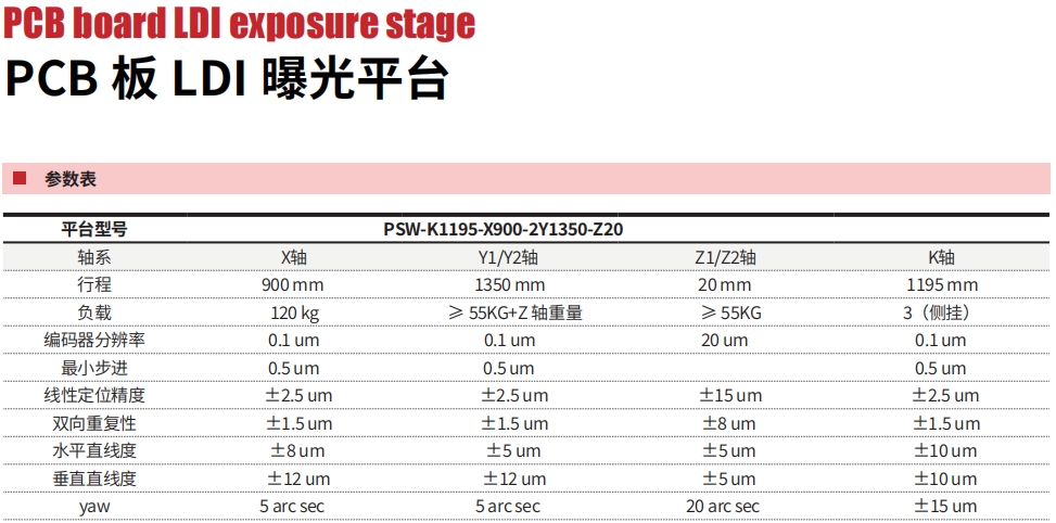 七轴LDI曝光机,全部采用无铁芯直线电机,直驱控制,无齿槽效应,在低速下可平滑运行(速度波动小),同时配备非接触式高精度光栅尺,具备****的动态性能、 定位精度和重复定位精度,七轴 LDI 曝光机选用高精度光栅位置反馈,全行程重复性小于 ±1.5um,定位精度小于 ±2.5 um,一般与高精度升降轴(Z 轴)配合工作等结构特点。主要应用在半导体生产线、微电子生产、LCD 显示、 LCD 显示、线路板生产、PCB 产品等要求高精度和高效率工业项目中。