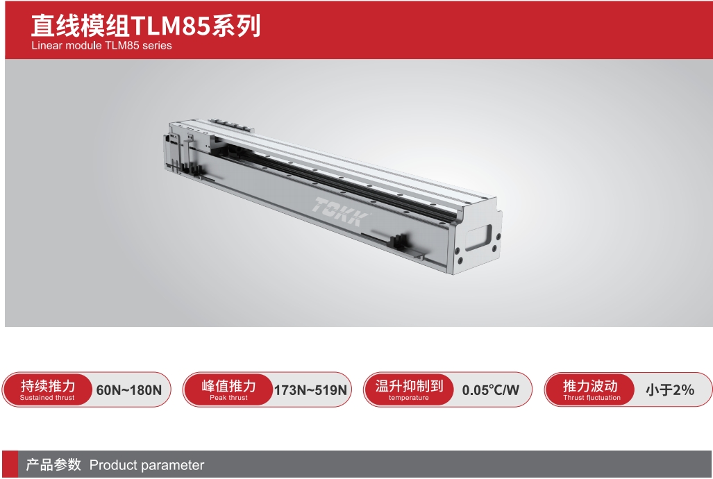 TOKK直线电机模组以其精度高、速度快、运行平稳、结构简单、集成度高、标准系列化、经济高效等特点,已广泛应用到诸多行业。同时得到行业的高度认可与青睐。从简单的搬运、传送到精密测量、精密加工,TOKK直线电机技术可应用到多种多样的加工工艺和工况场景。同时,可定制化灵活组合、高稳定性、高性价比等特性,可满足客户多元化的应用需求。