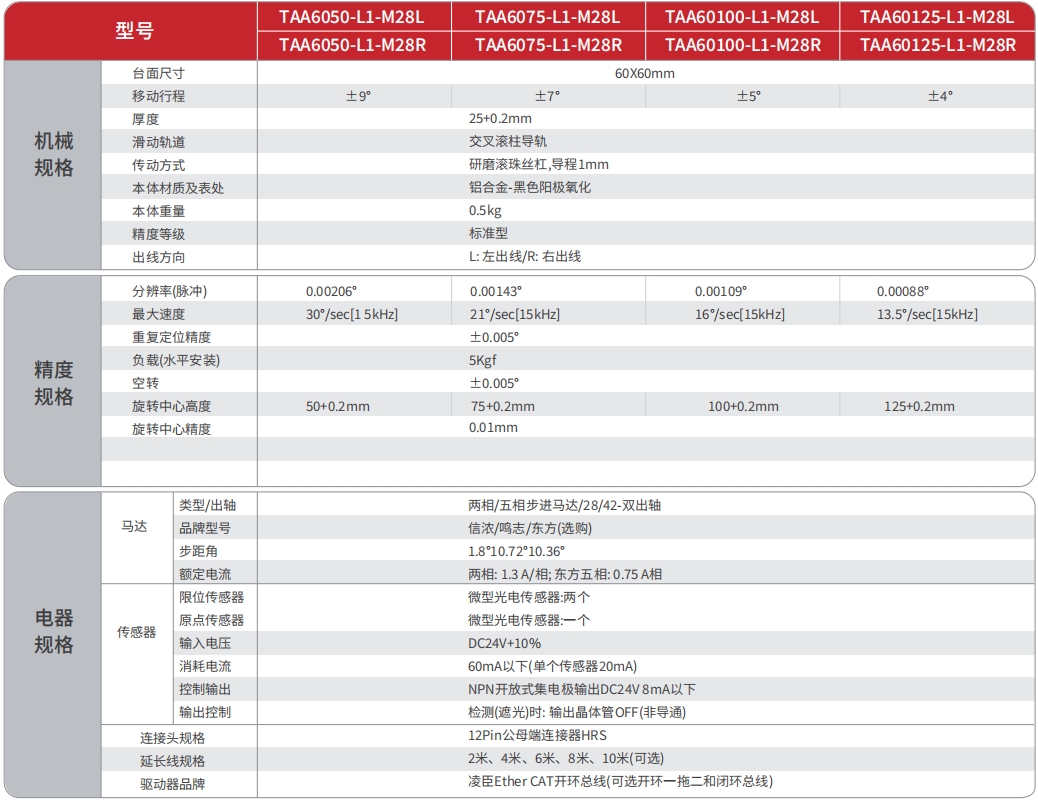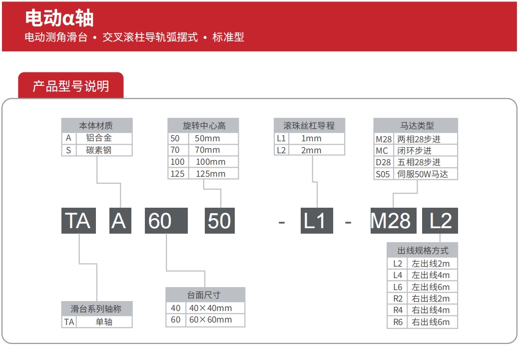 电动α轴铝合金滑台系列是TOKK为解决小空间、高使用频率等情况专门设计的电动摆动滑台。产品本体材料采用硬质铝合金,表面黑色阳极氧化处理,**防止反射光对光源的影响;传动部件采用高精密滚珠丝杠、弧形交叉滚柱导轨,耐磨性好、强度高、负载能力强;该系列产品非常适合集成在对空间、尺寸、重量要求较高的自动化设备、精密仪器设备中,也比较适合使用在运动范围较小、往复频率高的工业生产线中。