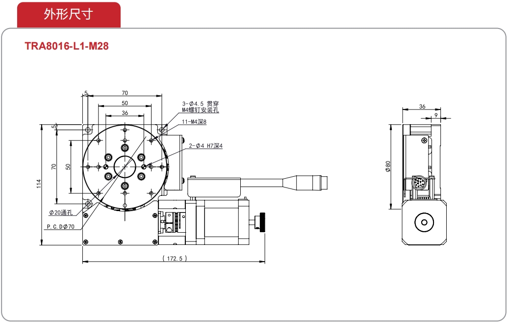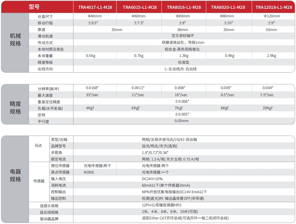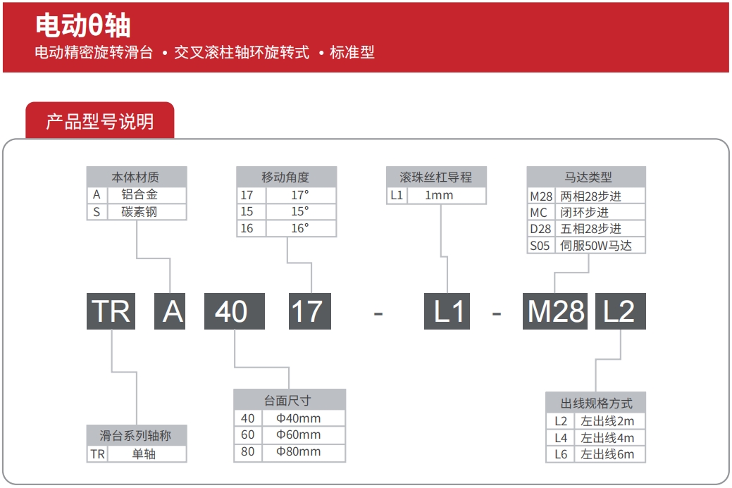 电动θ轴铝合金滑台系列是TOKK为解决小空间、高使用频率等情况专门设计的小角度电动旋转滑台。产品本体材料采用硬质铝合金,表面黑色阳极氧化处理,**防止反射光对光源的影响;传动部件采用高精密滚珠丝杠、交叉滚柱轴环旋转,耐磨性好、强度高、负载能力强;该系列产品非常适合集成在对空间、尺寸、重量要求较高的自动化设备、精密仪器设备中,也比较适合使用在运动范围较小、往复频率高的工业生产线中。