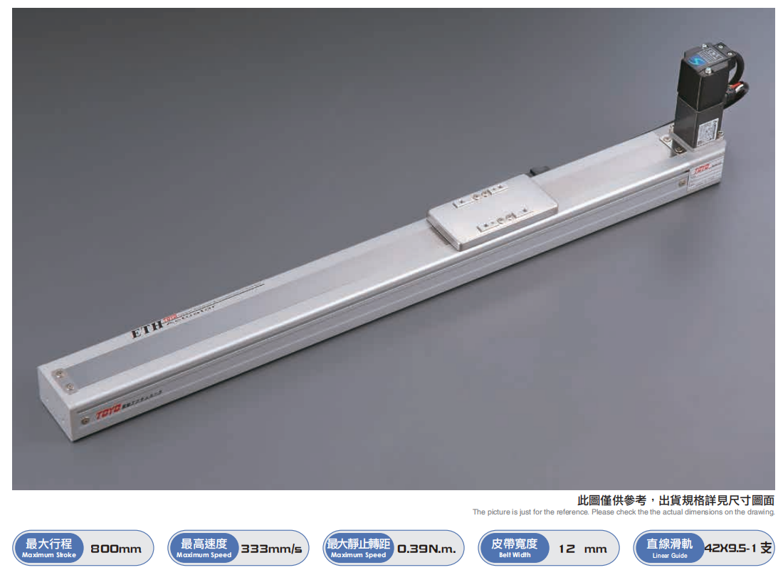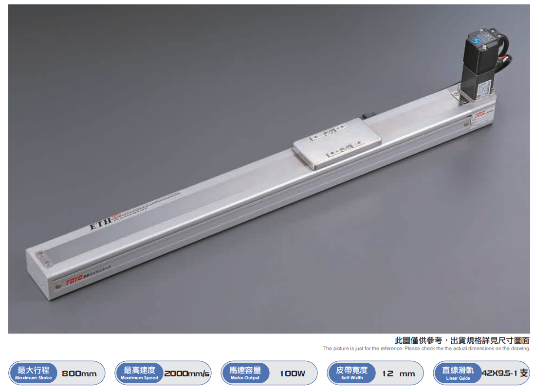 皮带系列直线模组适用范围为生产线工件换线装置、捆包胶膜切断装置、CNC加工机间搬运装置等用途。应用的产业有TFT-LCD液晶面板设备、太阳能设备、食品设备、包装设备以及CNC加工设备。