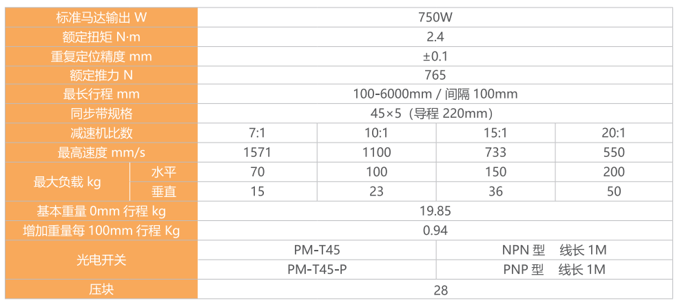 皮带系列直线模组适用范围为生产线工件换线装置、捆包胶膜切断装置、CNC加工机间搬运装置等用途。应用的产业有TFT-LCD液晶面板设备、太阳能设备、食品设备、包装设备以及CNC加工设备。